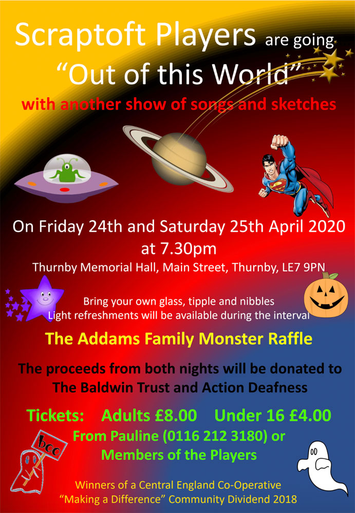 Their latest performance, “Out of this World”, takes place at 7.30pm on Friday 24th and Saturday 25th April 2020 in Thurnby Memorial Hall, Main Street, Thurnby, LE7 9PN. Tickets are £8 and are obtainable from 0116 212 3180. Bring your own glass, drinks and nibbles.”